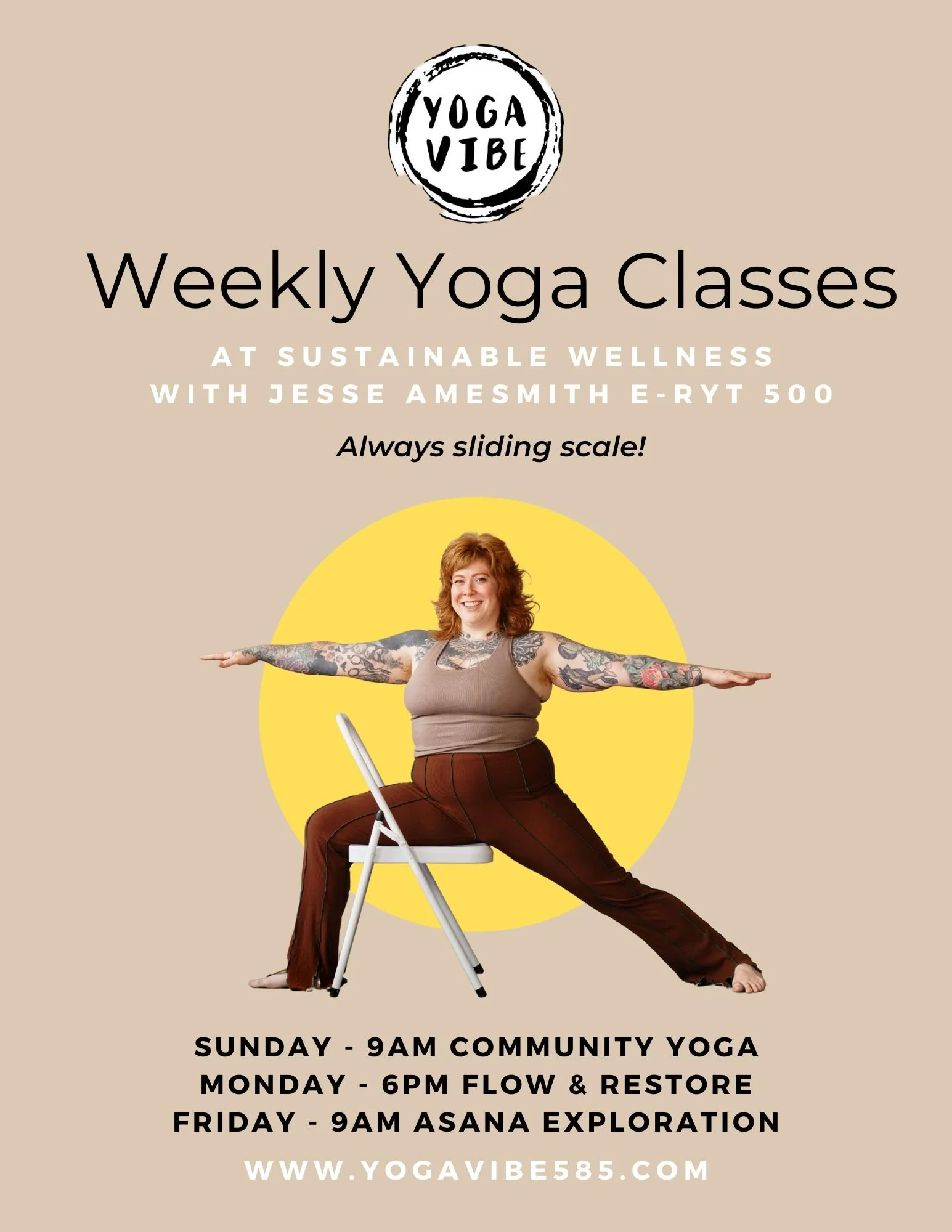 YogaVibe 585 sliding scale $8-20 Community Yoga is every Sunday at 9am at Sustainable Wellness in Village Gate Square, Suite A300 274 N. Goodman St. Rochester, NY 14607. Rotating instructors and styles of practice Register for class and save your spot here!